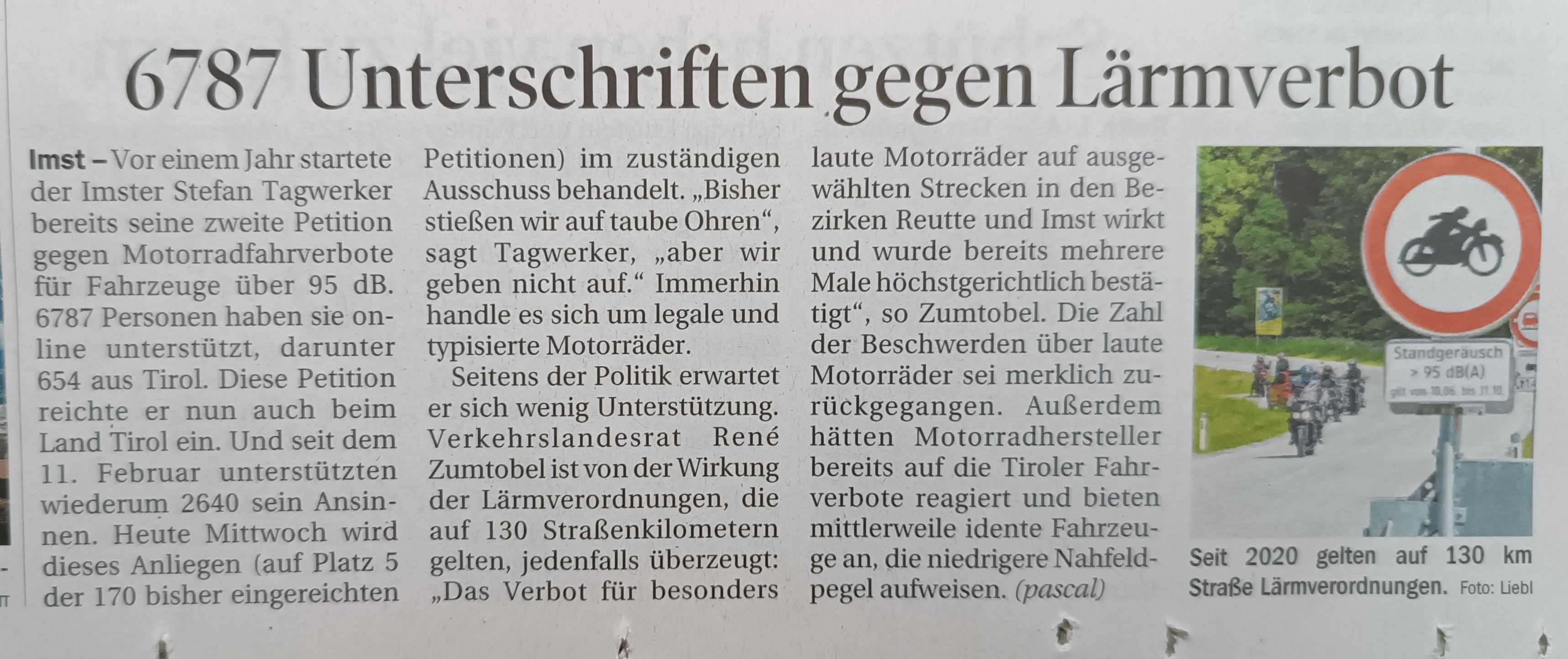 Diese Nachricht richtet sich an alle Tiroler Mitstreiter.Bitte motiviert weitere Motorradfahrer in Tirol,damit sie diese Petition unterstützen.