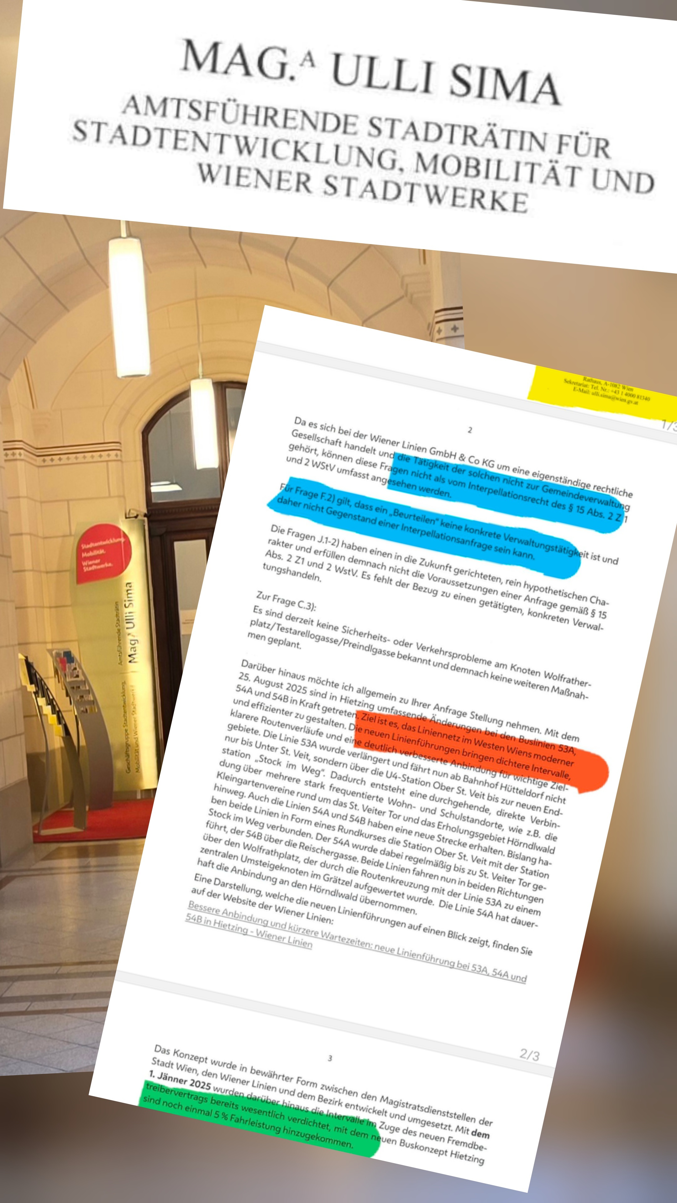 Darin enthalten ist mehr oder minder ein Wunsch einer Besserung der bestehenden Verbindung(en) für Anrainer/Öffi-Nutzer. Wir wünschen uns dazu, da dieses Schreiben bereits vor mehr als einem Monat eingelangt ist, nunmehr sehr, dass den Worten auch Taten folgen, da die bereits erfolgte Umstellung dazu keinesfalls dafür geeignet ist/war, deswegen fordern wir in unserer Petition ja eine Umdenken und eine Umkehr zum alten System der Rundlinien.