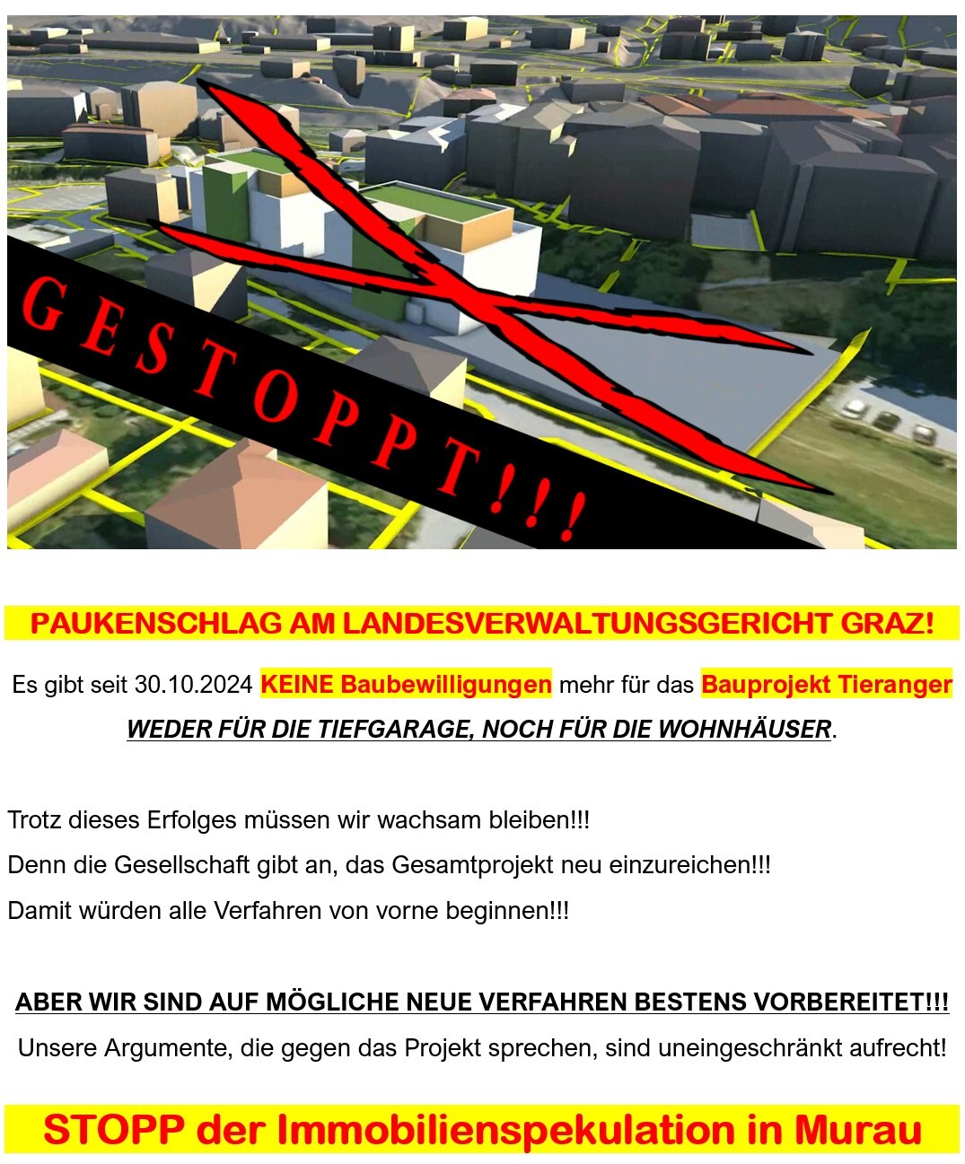 wie ich euch schon mitgeteilt habe, hat am 31.10.2024 die Verhandlung beim Landesverwaltungsgericht stattgefunden. In Verhandlung war der von der BH Murau erteilte positive Baubescheid betreffend den Bau der Tiefgarage.