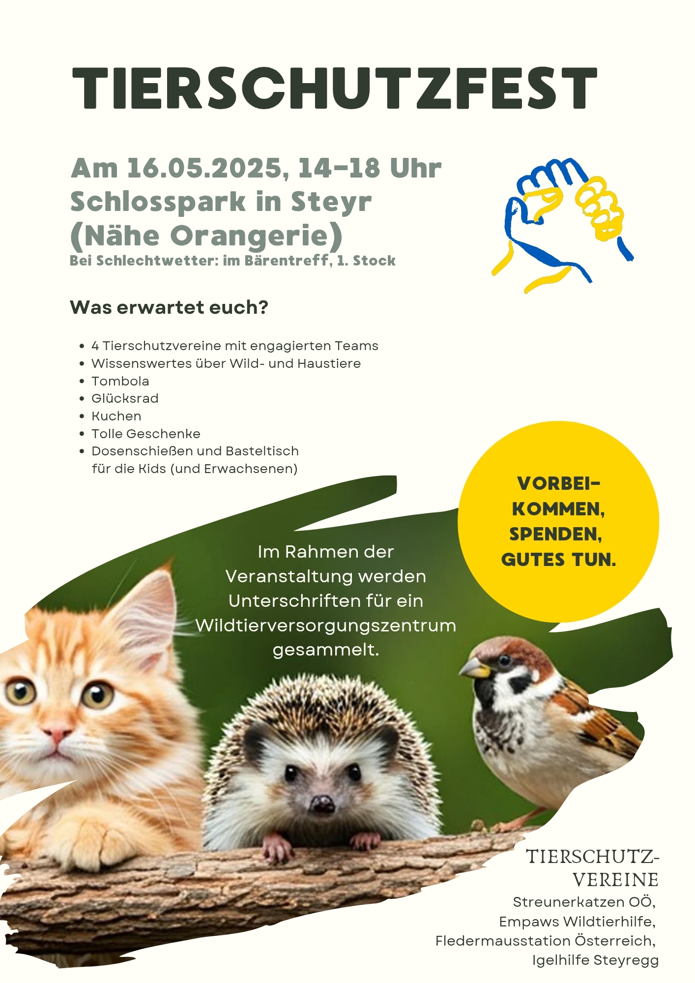 Wir stehen heute den ganzen Tag beim Hessenplatz in Linz. Ihr findet uns ab ca 11 Uhr ganz leicht, in dem ihr einfach den buntenTierspuren folgt :-)