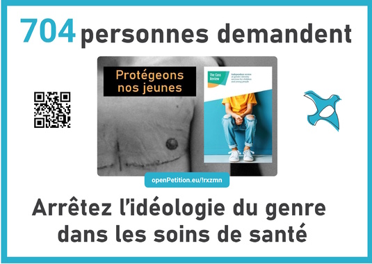 Les études ont montré que la dysphorie de genre est généralement une phase transitoire, souvent associée à la neurodiversité, aux problèmes de santé mentale, aux traumatismes de l'enfance etou à l'attirance pour le même sexe. Il n'existe pas de méthode fiable pour déterminer qui en sortira et qui n'en sortira pas. Comment justifier alors des interventions hormonales et chirurgicales qui causent des dommages irréversibles au développement du cerveau, à la fertilité, à la densité osseuse, à la santé mentale et au fonctionnement sexuel, entre autres.