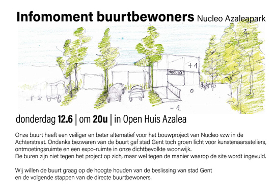 NucleoIn vzwSint-Amandsberg planthebben buurtbewoners een gedragen alternatief voor de geplande grootschalige verbouwing van heteen gebouwloods intot kunstenaarsateliers en een expositieruimte door Nucleo vzw op een achterliggend terrein tussen de Achterstraat.HetAchterstraat en het Azaleapark.Het wordt een complex met ateliers voor kunstenaarskunstenaars, een ontmoetingsruimte (ook voor de buurt) én een publieke ruimte voor 100 bezoekers — vlak naast onze huizen.Dathuizen. Dat klinkt misschien positief, maar in de praktijk dreigt dit project onze buurt ernstig te verstoren.verstoren.Begrijp ons niet verkeerd. De buurt is 100% vóór kunst. We hebben niks tegen Nucleo als onze buur en blijven in overleg met alle betrokken partijen. Zeker omdat er een realistisch en gedragen ontwerp werd gemaakt door de buurtbewoners, waar ook Nucleo achter staat.