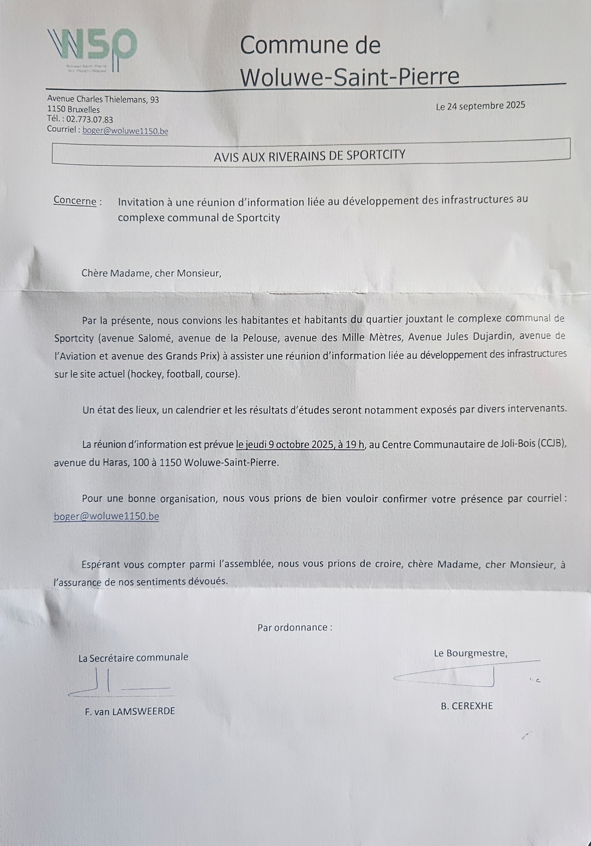 La commune tiendra une grande réunion le jeudi 9 octobre 2025 à 19h au Centre Communautaire de Joli-Bois (CCJB), avenue du Haras, 100 à 1150 Woluwe-Saint-Pierre, à quelques pas du centre sportif.