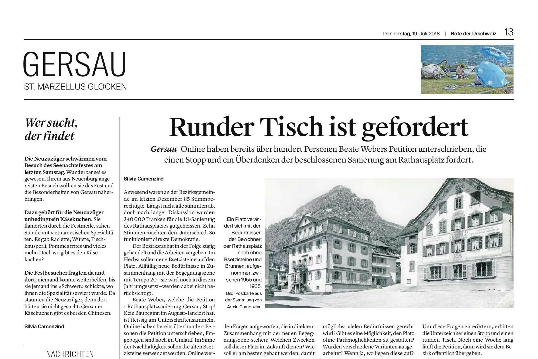 Helft mit und redet über die Rathausplatz-Sanierung im August! Jeder Gersauerin und jedem Gersauer muss hier klar werden, dass wir mit dieser Petition ein anderes Vorgehen möchten. Günstiger, da die alten Steine verwendet werden können und einen neuen Zeitablauf. Sonst kollidieren die Bauarbeiten Neuheim mit der Sanierung Rathausplatz! Überdenken und einen Gestaltungsplan auflegen, damit sich der Bürger informieren kann! Für unser Geld und Gersau einen besonderen Platz - setzt Euch dafür ein!