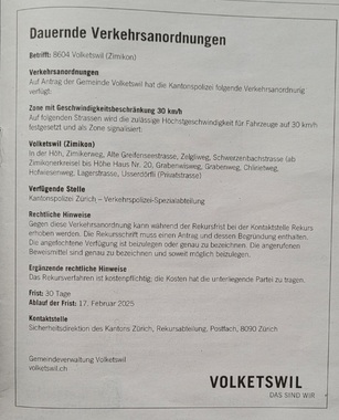 In den Volketswiler Nachrichten wurde heute eine Verkehrsanordnung publiziert (siehe Bild). Wenn keine Einsprachen eingehen und bzw. allfällige ohne Erfolg sind, dann steht der 30er Zone nichts mehr im Wege!