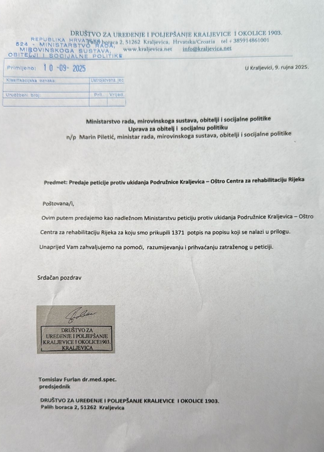 10. rujna 2025. Peticija protiv ukidanja podružnice Kraljevica – Oštro centra za rehabilitaciju Rijeka i izmještanja štićenika u objekt "Kloštar" u Praputnjaku s komentarima predana je i urudžbirana u pisarnici Uprave za obitelj i socijalnu politiku Ministarstva rada, mirovinskoga sustava, obitelji i socijalne politike te je poslana na više email adresa u Ministarstvu i na znanje pravobraniteljici za djecu Helenci Pirnat Dragičević.
