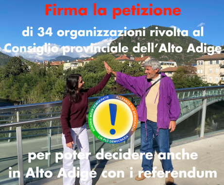 - In una lettera aperta, 34 organizzazioni e 1.054 cittadini chiedono con una petizione che, con l'approvazione dei due disegni di legge ora all'esame del Consiglio provinciale, vengano creati i requisiti minimi necessari per rendere applicabili gli strumenti referendari previsti dallo Statuto di autonomia.
